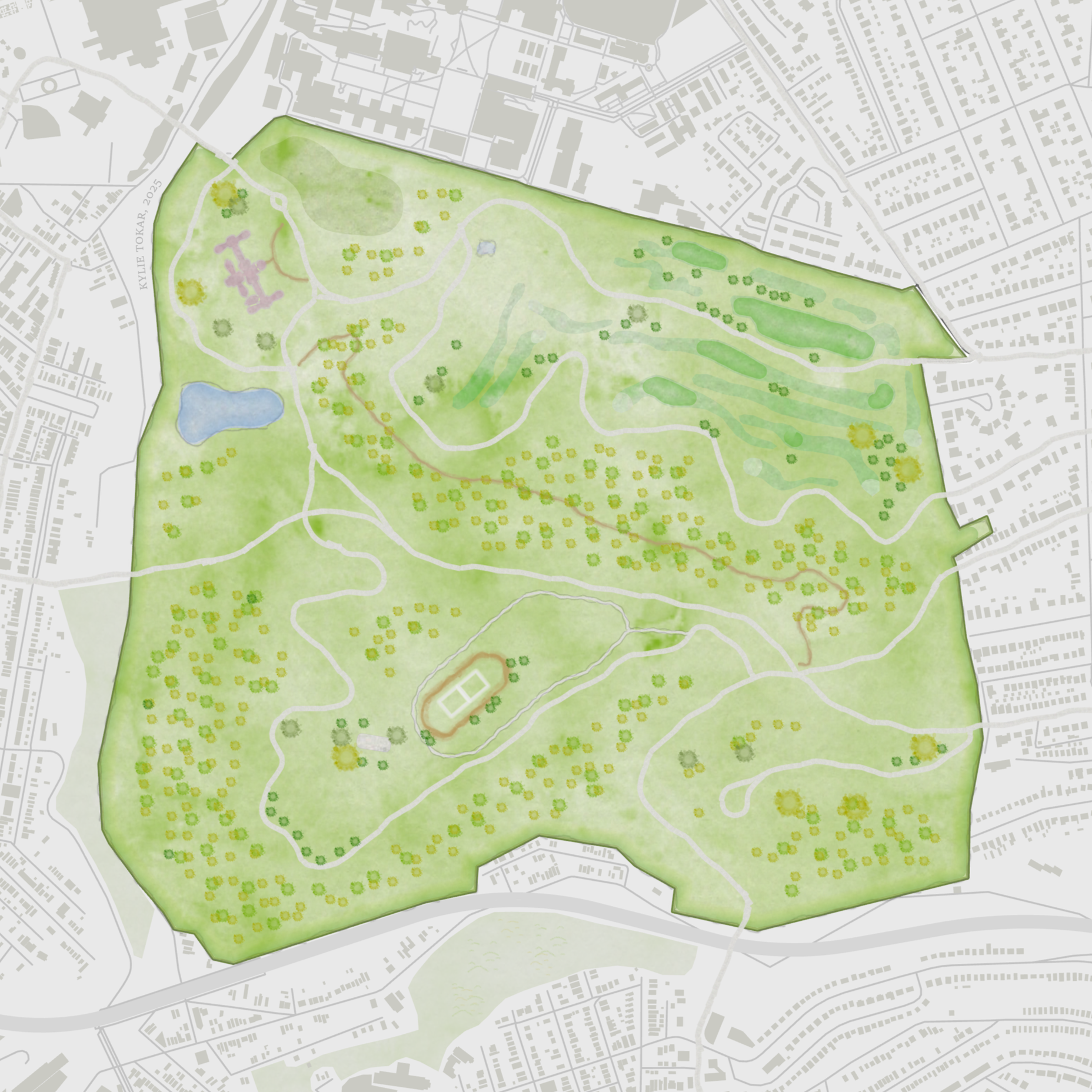 Designed in GIS using custom symbology (highly influenced by John Nelson’s Watercolor Style kit), this map depicts one of Pittsburgh’s beloved city parks. Available in print!